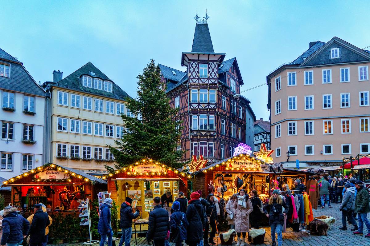 MARBURG, GERMANY – 4 December, 2022: : Old market place with the christmas decoration, old houses with stores, restaurants and visitors of the christmas market. Traditional Christmas market.