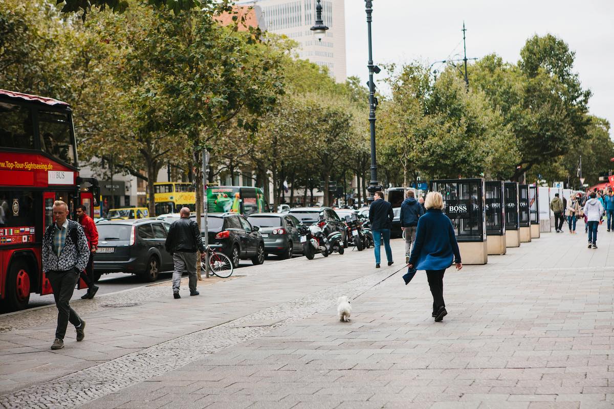 Berlin, October 1, 2017: City street with people and cars. Normal city life. A woman walking a dog, others go about their business.